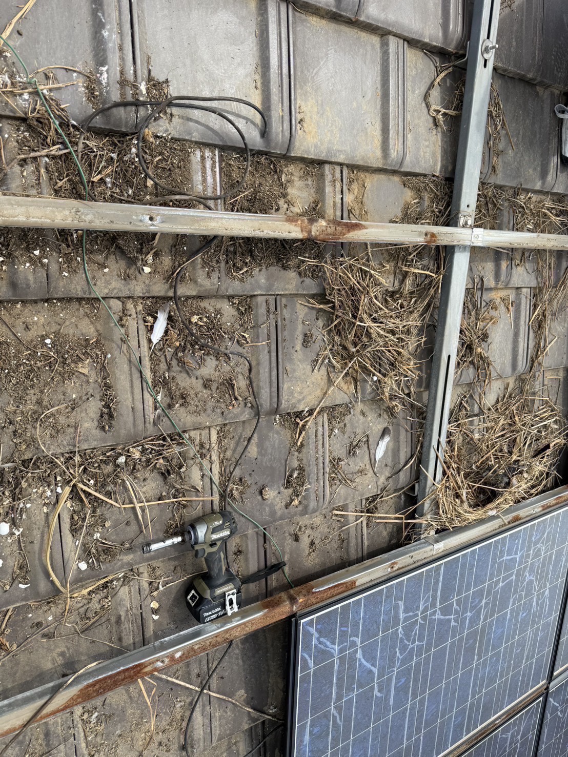 太陽光パネルの下に鳩が巣を作り、糞害や配線損傷、騒音など生活への支障が出て困っている。